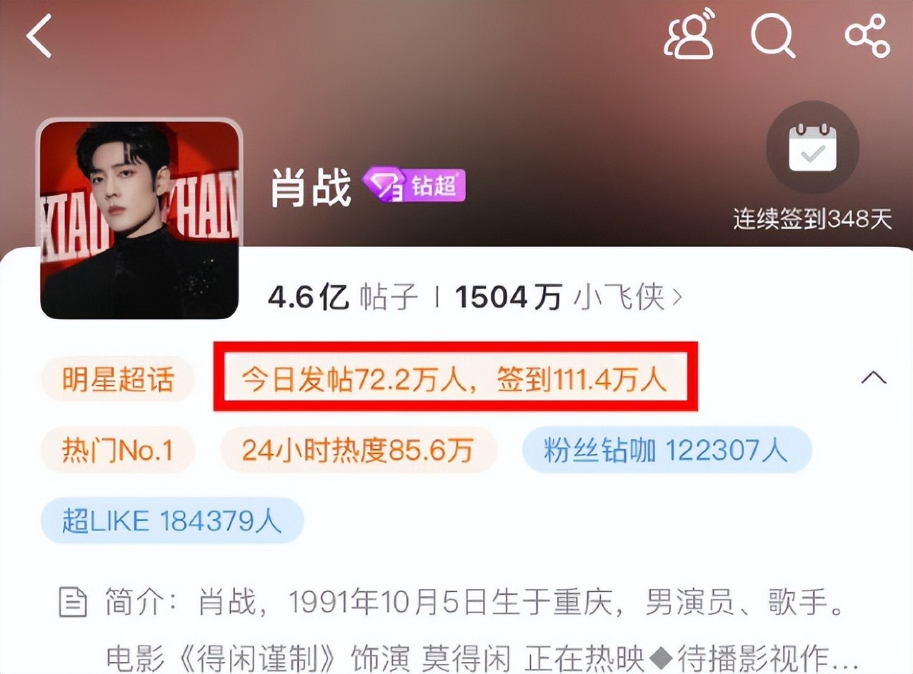 在打投的时候,肖战的单日超话签到达到111.4万人,发帖72.2万人,活动期间,超话热度亮眼数据连续维持7日。